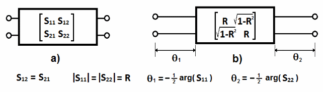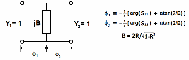For synthesis purpose, each waveguide junction (iris, step, cavity) with zero-length interface and with given complex s-parameters (Figure 2a) is represented as a lumped element with real values of reflection and transmission coefficients (Figure 2b) and with interface having certain electrical length (given by expressions in Figure 2). Such a distributed network element is further represented as an equivalent shunt susceptance (Figure 3) with corresponding electrical phase.