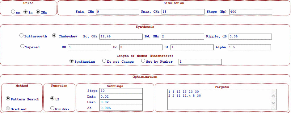 The optimization is perform as an iteration algorithms, which minimizes a cost function representing a deviation of simulated performance from the targets (specs). There are two types of optimization functions are available. The L2 evaluates the root mean square of the selected s-parameter magnitude simulated over the specified frequency ranges relative to the specified targets. The MiniMax minimizes the maximum value of the selected s-parameter of simulation (the worst case) found within the specified frequency ranges relative to the corresponding spec target. In the both cases the optimizer has a goal to achieve a performance, which is better (not equal) than the specs. For example, if we design a filter with 23 dB return loss and 50 dB near-band rejection, the optimizer would tend to achieve more dBs (say 35 dB return loss and 70 dB rejection if achievable). In case of preventing “over-optimization”, a user can interrupt the optimization during the process or initially set lesser number of iterations.