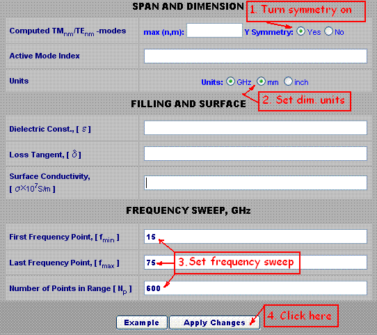 Initial Setup page contains all the general information about symmetry, units, modes, environment, materials and sweep. We have to enter those basic parameters in a form shown on Figure 1 and click the "Apply" button.