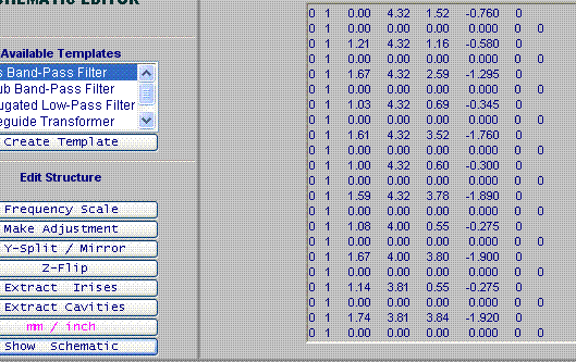 Structure Editor page. Here we can enter the dimensions of the filter and execute simulations. Although we have the table of all dimensions defining the filter (see Table 1), we would need to enter those dimensions in the format acceptable by WR-Connect. The software (WR-Connect) reads the dimensions in a special format and requires more details about type of connections. Waveguides of the same rectangular type can be connected by different ways in respect to computational models. WR-Connect handles three types of connections of uniaxial rectangular waveguides, i.e. "impedance steps", "cavities" and "diaphragms". If even the same waveguide structure can be represented by any of those types, the accuracy of computation is greater if applied to the "cavity" type. As the discussion behind those types of connections may seem confusing, there is a simplified way of entering data. First we enter all the dimensions from the Table 1 in the following order: