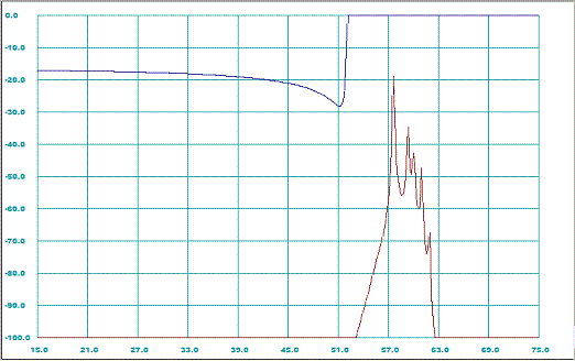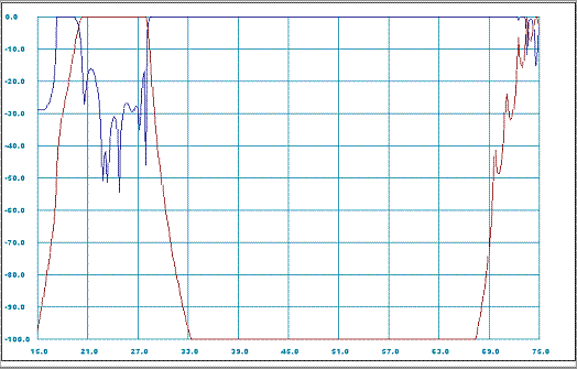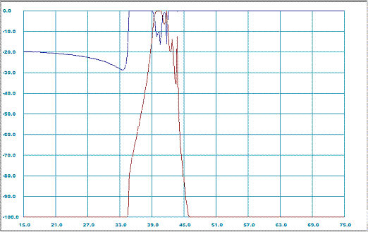 Figure 3: Reflection and transmission (dB) versus frequency (GHz) characteristics for the filter [4: design 2] represented as sequence of E/H-plane step junctions.