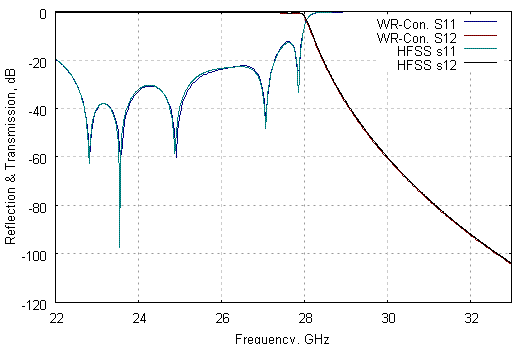 The reflection and transmission coefficients computed by WR-Connect over the frequency range from 22 to 33 GHz are shown on Figure 7 with navy and maroon coloured lines respectively. The same wave-guided structure [4: design 2] represented by WR-Connect project code (Table 3) and exported as HFSS model, splitted on E-plane and E-plane boundaries and ran using an interpolative sweep over the same frequency sweep. The results obtained by HFSS are shown on Figure 7 with reflection and transmission coefficients coloured by green and black lines respectively.