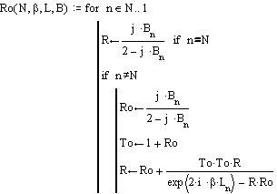 Performance verification needs a programming tool. MathCAD is the simplest to simulate the filter response. Calculating the frequency response of the filter is based on cascading s-parameters of each iris N times. In terms of MathCAD that procedure looks like a loop function shown on the figure. The B-values presented there differ over frequency, so their values must be computed for any particular frequency point. The loop can be easy realized in FORTRAN, provided by an interface, compiled and used as stand-alone module forever. Real surface loss may be inserted using complex b where the imaginary component is the waveguide attenuation number multiplied by about 1.5 (experimentally found correction). |