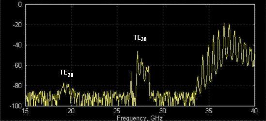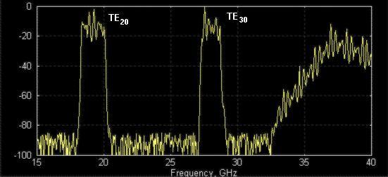 Figure 2: Transmission response measured using “exciters” of higher order modes (regular setup components do not excite them much). The both TE20- and TE30-modes popped up, because not rejected by filter.