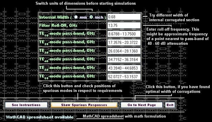 As the modes composition of the macro system is unknown, it is better to assume the worst case of existence of all the bad modes. Generally there is no way eliminate the spurious pass-bands for a corrugated filter except moving them out of the important frequency bands. The positions of pass-bands of spurious modes depend on pass-band of the dominant mode and the width of corrugated waveguide. Therefore it is a good idea to locate bands with potential lack of rejection in respect to rejection requirements. The picture shown on Fig 3 tells how to predict pass-bands of spurious modes using the first design step page.