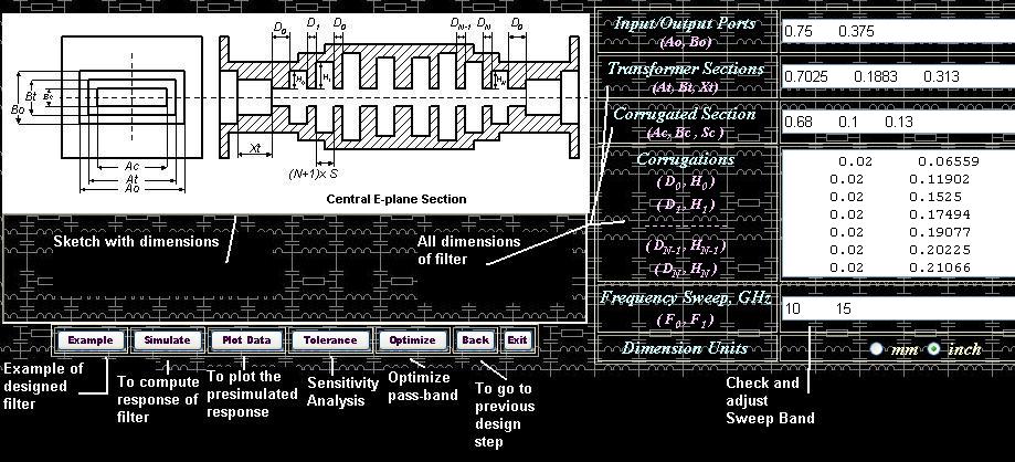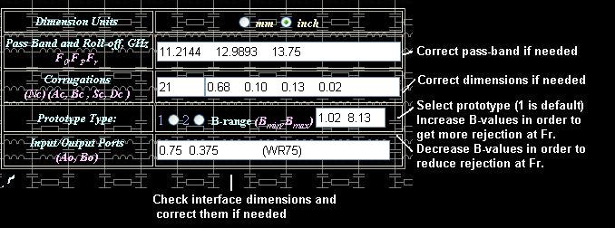 If the “spurious” width is determined, other dimensions of corrugated filter can be obtained by following simple procedure. The design procedure presented here differs from conventional design procedures based on direct synthesis of filter dimensions using equivalent circuit networks and special functions or polynomials. The conventional procedures are found to be practically ineffective because they make accent on pass-band performance rather than higher stop-band where the prototype networks do not model electromagnetic propagation in waveguide structures. Therefore the design procedure used here is based on selection of prototypes of good upper stop-band rejection and bad pass-band performance and further optimization of pass-band. There are two types of prototypes used here. Prototype [option 1] is preferable if end frequency point of upper stop-band is less than 2.5-3 times central frequency of the filter pass-band. The option #1 provides better initial pass-band performance and therefore is easier to design. The prototype [option 2] is preferable to reject frequency spectrum up to 3-4 times of central frequency of the pass-band. Since you have entered roll-off and width of corrugations in the first design page, the synthesizer will try to find optimal values for Bmin and Bmax values, the network parameters of prototype.