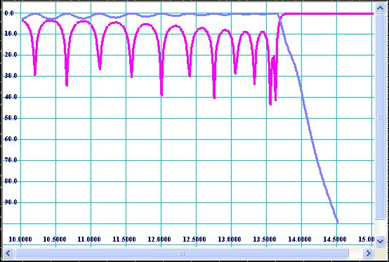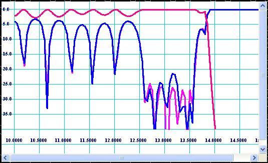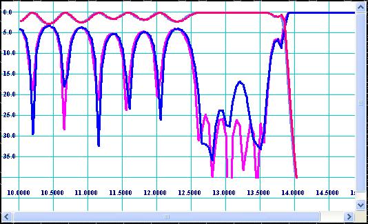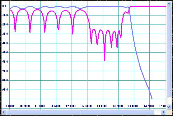 During and after optimization the filter has to be virtually tested over wide frequency sweep for spikes and zones of lack of rejection. The Fig 12 shows wide sweep frequency transmission response for the optimized design.
