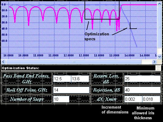 No customer indeed will be happy with a harmonic filter having such an ugly pass-band performance shown on Fig 8. Therefore the design is not completed until the reflection ripples of the filter pass-band are not reasonably small. Therefore we need an optimizing tool in order to improve the performance of filter pass-band. Although pass-band performance of “draft” design is so low, it might need some slight adjustment of corrugations and transformer steps in order to make it much better. Optimizer is a tool, which runs various combinations of dimensions and computes the path of improvement (gradient) of a function of performance (functional). Therefore it is important to specify optimization goals and limits (constrains) effectively in order to achieve the best performance. Example of selection of optimization constrains is shown on Fig 9.