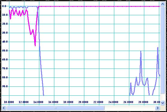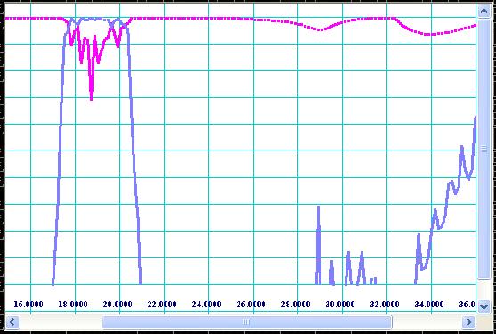 It should be noticed that the response obtained by simulation over high frequency spectrum corresponds to TE10-mode transmission and reflection only. It is recommended to check the responses of spurious modes also. In order to do so, simply replace internal width of corrugations (see Fig 6) by Ac/2 value for TE20-mode, Ac/3 for TE30-mode, Ac/4 for TE40-mode, etc and compute frequency response. For our example, values 0.34 (0.68/2) and 0.2267 (0.68/3) are entered for modes of TE20 and TE30 respectively and plots shown on Fig 13 and Fig 14 are obtained.
