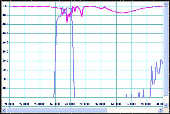 If you press [Plot] button, you can see plot of reflection and transmission in dB vs. frequency. Please do not expect performance of initial design to be great. The picture below (see Fig 8) shows how it usually looks like.