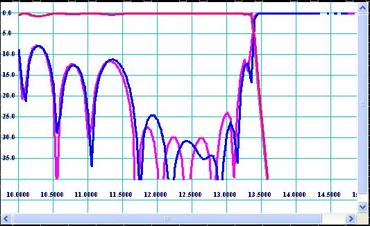 As it is practically impossible to produce hardware with dimensions identically equal to the dimensions assumed to be optimal (designed) because of inaccuracy of real production methods, it is at least useful to know what kind of performance the reality hardware would demonstrate. Different production methods such as EDM, milling, casting, galvanic forming, water jets, and others have their characteristic tolerances. In conformity with corrugated filters the most popular production methods can be specified by rounding of straight corners and deviation of positions of vertexes of cavities. The both effects may be evaluated by Sensitivity Analyzer linked to the Simulator by [Tolerance] button. Four types of manufacturing tolerances are specified there. “Random” tolerances are random manufacturing errors applied to all vertex positions of waveguide junctions. Naturally the random errors are supposed to have Gausian distribution of probability density over increment. Nevertheless here linear distribution is used because of having practical sense. For example, in accordance with probability theory and life experience any great error can occur, but if the error succeeds the specification, production people consider it as a defect. As they are “random” tolerances they can appear in great number of combinations. Therefore the filter structure must be tested over at least several combinations of tolerances, which can be simple done by pressing [Apply Tolerances] button several times. In many cases design engineers are interested in effect of [Worst Case] combinations. Worst case means the tolerances distributed over filter structure in combination giving the worst impact on performance of the filter. Practically probability of such combinations is negligibly low, but it is also considered by conservative product engineers. H-plane milling tool radius is radius of milling cutter applied to corrugation on H-plane, i.e. if the filter is composed from two half bodies to be connected on central H-plane by flanges. H-plane assembling is easier to produce by milling, but it is less reliable than E-plane assembling because potential flange contact problems. Although E-plane assembling has a big advantage such as insensitivity for flange contact quality, it is seldom used because it is larger than H-plane one, more sensitive for cavity rounding and it requires deeper penetration of cutter (larger cutter is required). EDM is very accurate, so tolerances and radii are negligible small. However it is expensive and therefore production people do not like to use it for mass production. Galvanic forming has advantage over “machine” methods, as it can build filter as monolithic unit with no contact flanges. However galvanic methods are less accurate and have environmental problems. It is direct responsibility of design engineer to provide sensitivity analysis over possible production methods in order to eliminate potential quality assurance problems. For example the frequency response shown on Fig 11 may degrade to the response shown on Fig 15, if reasonable production errors are applied (radius of milling tool is 0.064’’ and random tolerances are +/- 0.0005’’). Nevertheless, the “example” filter (press [Example] option of Simulator) shows much less degradation of frequency response caused by the same production tolerances.