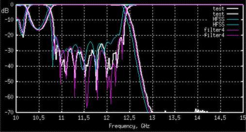 For short filters and great number of passes HFSS can give slight better similarity with the reality (See Fig 19) and always has to be used as final design verification tool. Nevertheless, designing harmonic filters I would recommend always relying on final HFSS simulation. It is a good idea, because if your design fails, you always can blame HP, Ansoft or Agilent (whoever is the license provider), but blaming my Design Studio nobody of managers would take seriously.