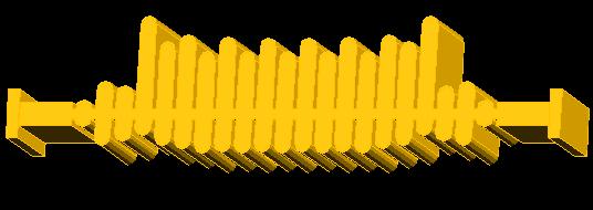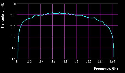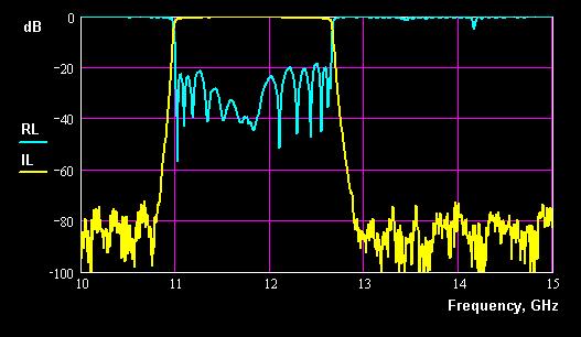 | Ku-band composite asymmetric E-plane corrugated band-pass filter. Similar filter was proposed for SkyBridge space program. In spite of small dimensions (4.18''x1.82''x1.19'') the filter provides relatively high multipaction breakdown 3000W (0.080'' min voltage gap) and more rejection of spurious spectrum than 15'' long conventional cascade of iris filter of at least 15 poles and corrugated filter of at least 15 corrugations. |
